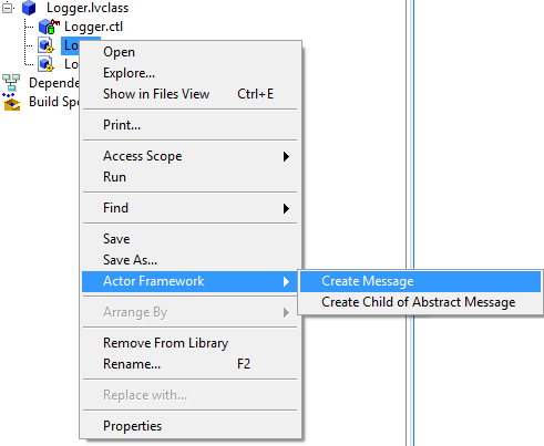 Right click on the “Log” Method in the project explorer. From the menu select Actor Framework -> Create Message.