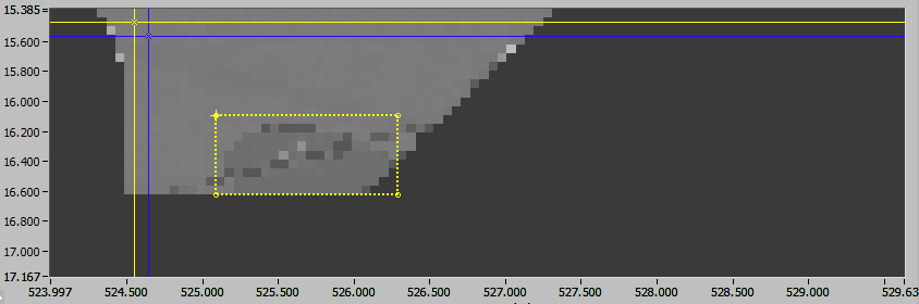 These last two techniques are tricks where two graphs are made to look like one in order to combine features. In this one, an XY graph is carefully aligned atop an intensity graph. The dotted rectangular box which was in a plot image in the previous technique is now just a data plot. Cursors have also been placed at each vertex so that, with some coding behind the scenes, the user can edit the box similarly to how they’d edit an Image ROI. You could do all of the same things with plot images, but this method has the advantage/disadvantage that you block direct mouse access to the intensity graph (and its cursors) while you have the XY graph showing.
